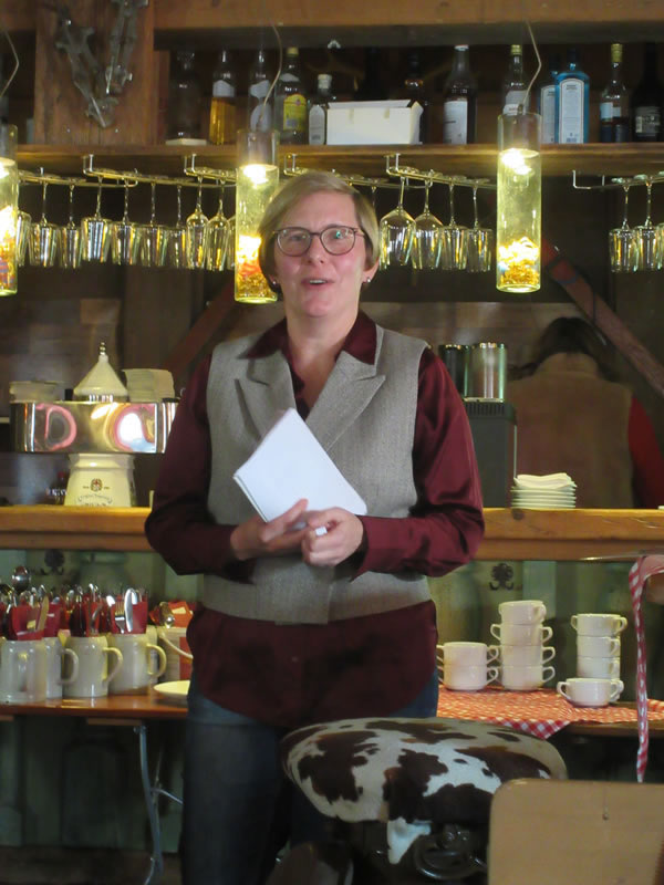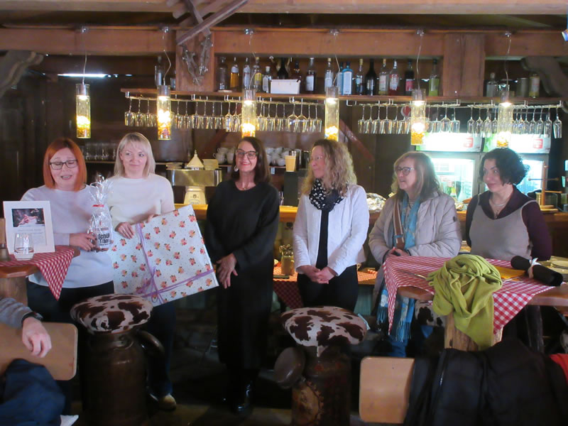 In humorvoller Art und verpackt in die Phasen einer Unterrichtsstunde, beginnend mit der Schulglocke ihres Vaters und einem stummen Impuls, blickte Bettina Faber-Ruffing auf ihre Dienstzeit zurück. So erinnere sie sich beispielsweise gerne an Lesenächte in der Schule, an das Theaterstück, das sie mit ihren Schülerinnen und Schülern zum 25-jährigen Jubiläum der Schule aufführte und an einen Sponsorenlauf für ein Wasserprojekt in Nigeria, aber auch an die schönen Klassenfahrten, Schüleraustausche und an die vielen Fahrten, die sie zusammen mit ihren Kolleginnen unternommen habe. Dazu gehörten nicht nur acht deutsche Ziele, sondern auch St. Petersburg, Madrid, Sevilla und Istanbul. Darüber hinaus habe sie viele pädagogische Reformen erlebt, aber auch, wie man sie wieder abschaffte. Zum Schluss fragte sie die Anwesenden noch nach Tipps, was sie nun in ihrem Ruhestand alles tun könne und beendete ihre „Unterrichtsstunde“ augenzwinkernd mit dem Stellen der Hausaufgabe.