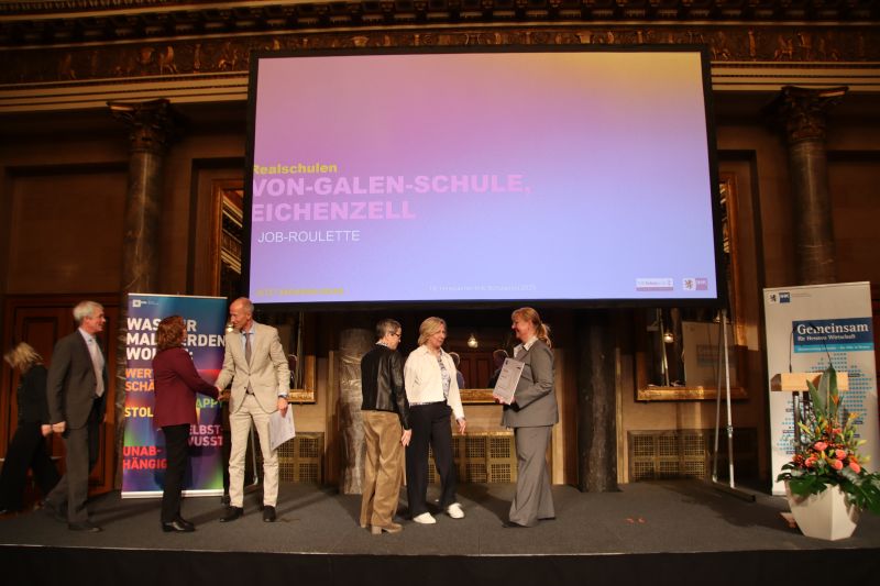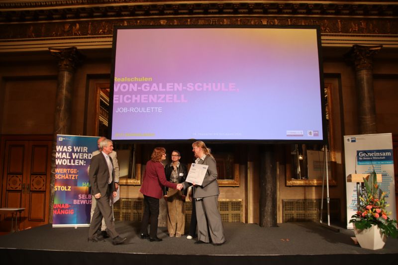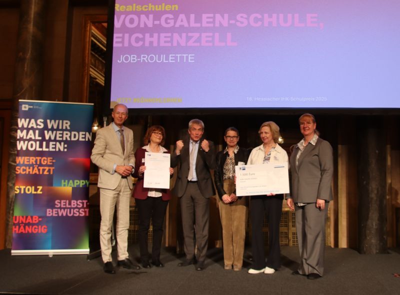 Zum 18. Mal verlieh der Hessische Industrie- und Handelskammertag (HIHK) den IHK-Schulpreis an Schulen, die mit kreativen Projekten Schülerinnen und Schüler auf ihren Berufseinstieg vorbereiten. Aus 68 eingereichten Projekten wählte eine sechsköpfige Jury neun herausragende aus. Unter den Preisträgern war auch die Von-Galen-Schule Eichenzell, die gemeinsam mit der Mediengruppe Parzeller das Projekt „Job-Roulette“ einreichte. Jede ausgezeichnete Schule erhielt ein Preisgeld von 1.500 Euro.