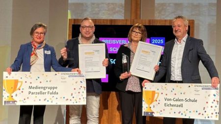 Die Mediengruppe Parzeller und die Von-Galen-Schule Eichenzell gehören zu den Bundessiegern des SCHULEWIRTSCHAFT-Preises 2025. Projektleiter Mirko Luis und Schulleiterin Bianka Roth nahmen die Auszeichnung am 14. November 2025 in Berlin entgegen.