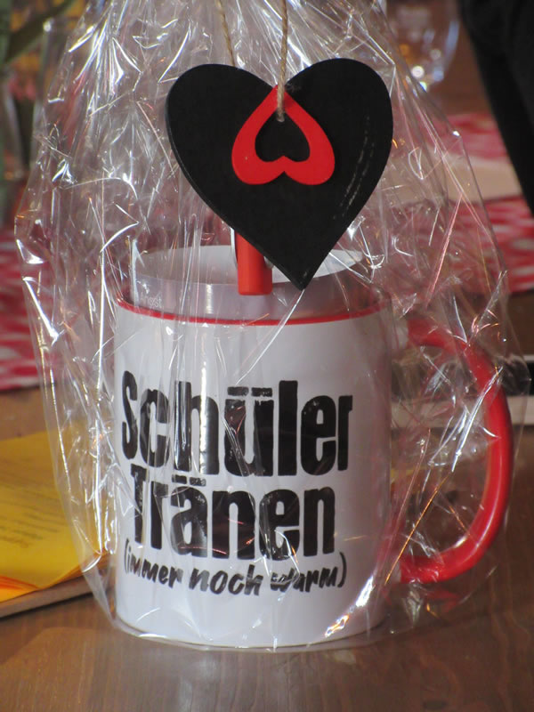 Auch die Tischnachbarinnen der neuen Pensionärin überreichten ein Geschenk: ein von Kunstlehrerin Natalie Gal gemaltes Bild sowie einen Stick mit einem Video, das Lada Turovsky zusammengestellt hatte. Neben guten Wünschen von Lehrkräften und der Klasse H9, deren Klassenlehrerin Bettina Faber-Ruffing bis zum Sommer 2025 war, wurden zahlreiche Eigenschaften genannt, die man mit ihr verband, und darüber nachgedacht, wie viele Schülerinnen und Schüler sie im Laufe der Jahre wohl unterrichtet haben könnte.