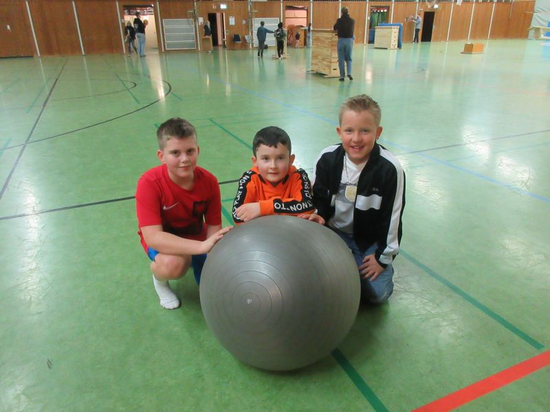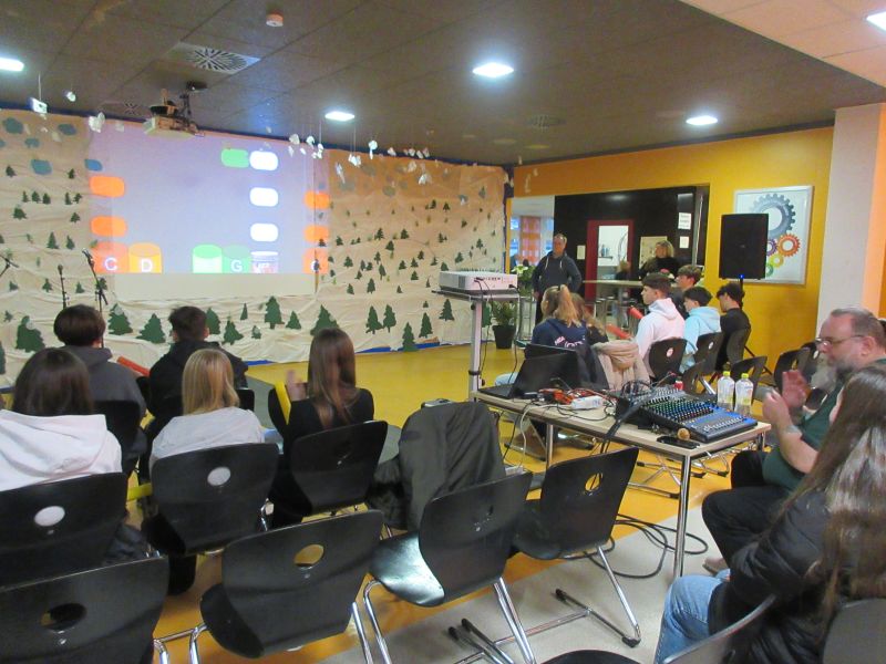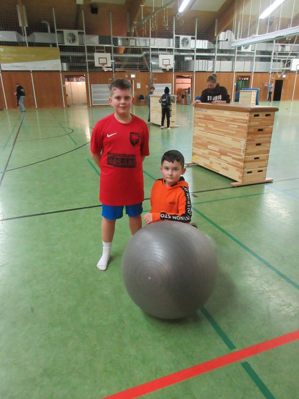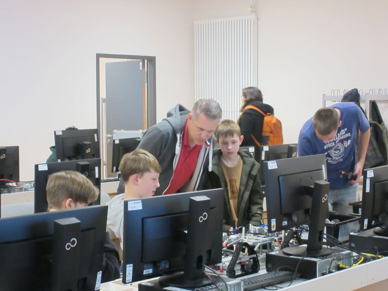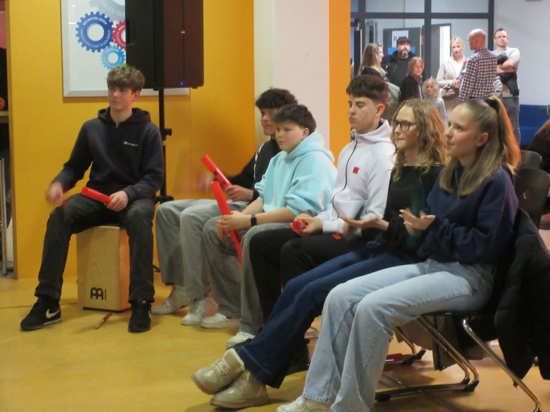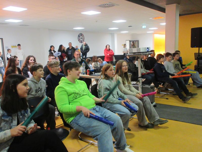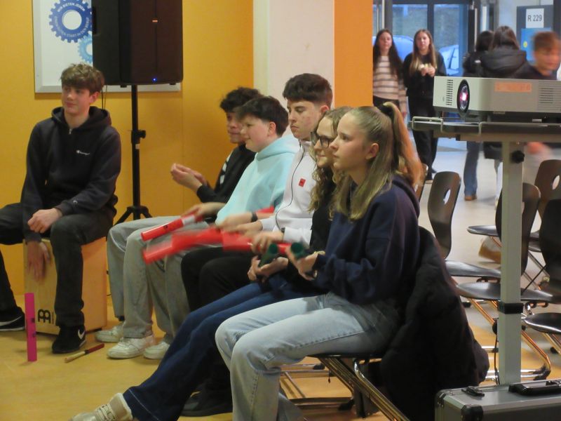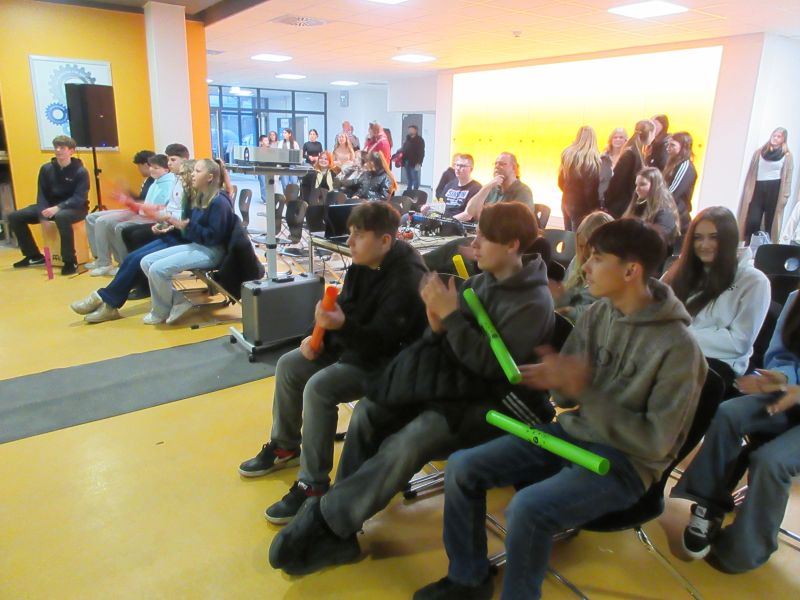 Auch in der Kreissporthalle warteten verschiedene Mitmachaktionen auf die jungen Besucher. Großen Anklang fanden außerdem die musikalischen Darbietungen der Gitarren-AG unter der Leitung von Peter Schmuck sowie die beiden Boomwhacker-Aufführungen der Klassen H6 und H8 unter Leitung von Constantin Kuhn. Besonders spannend für die jungen Gäste waren zudem die Ergebnisse der AG LEGO-Robotic sowie die moderne IT-Ausstattung der Schule.